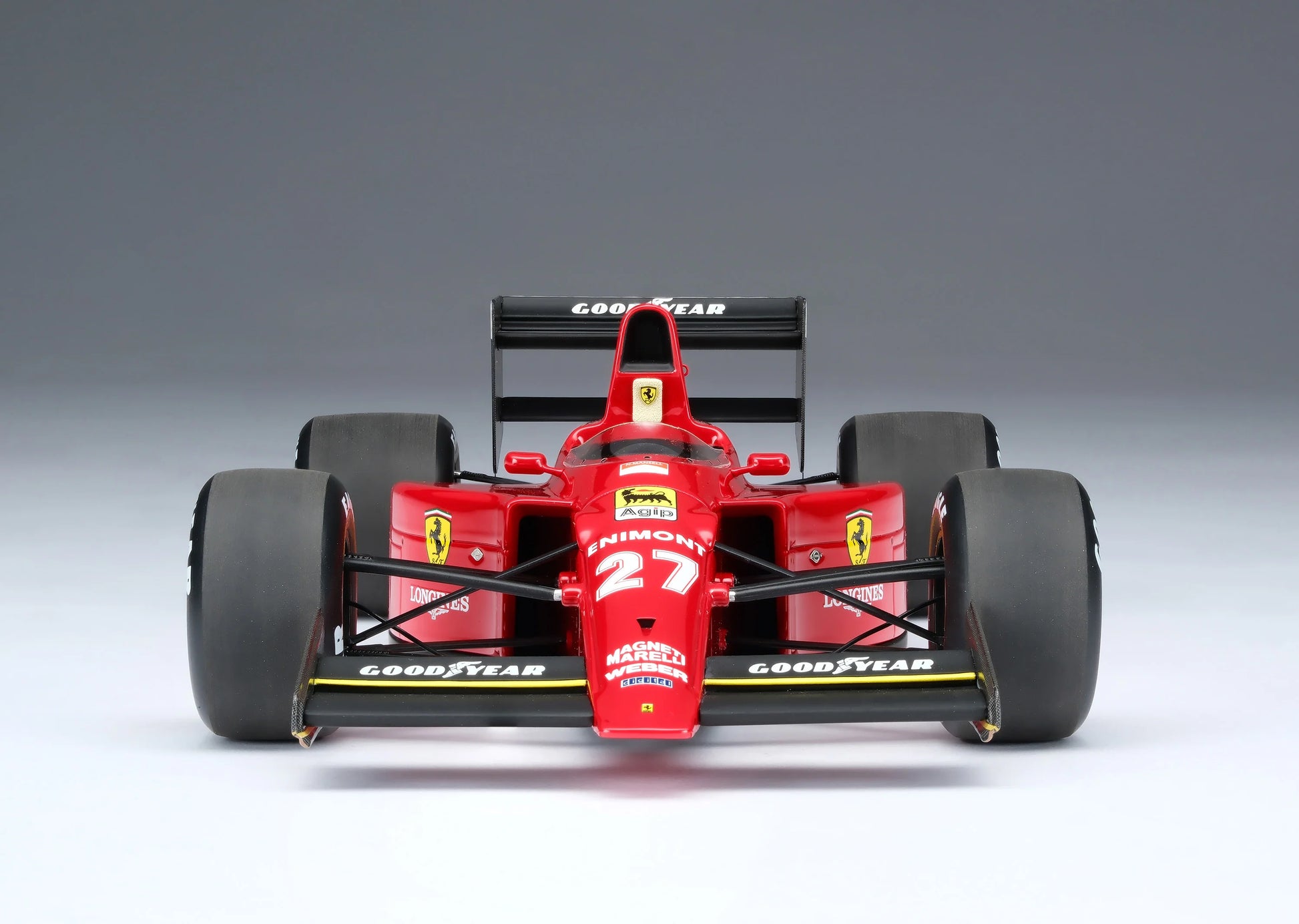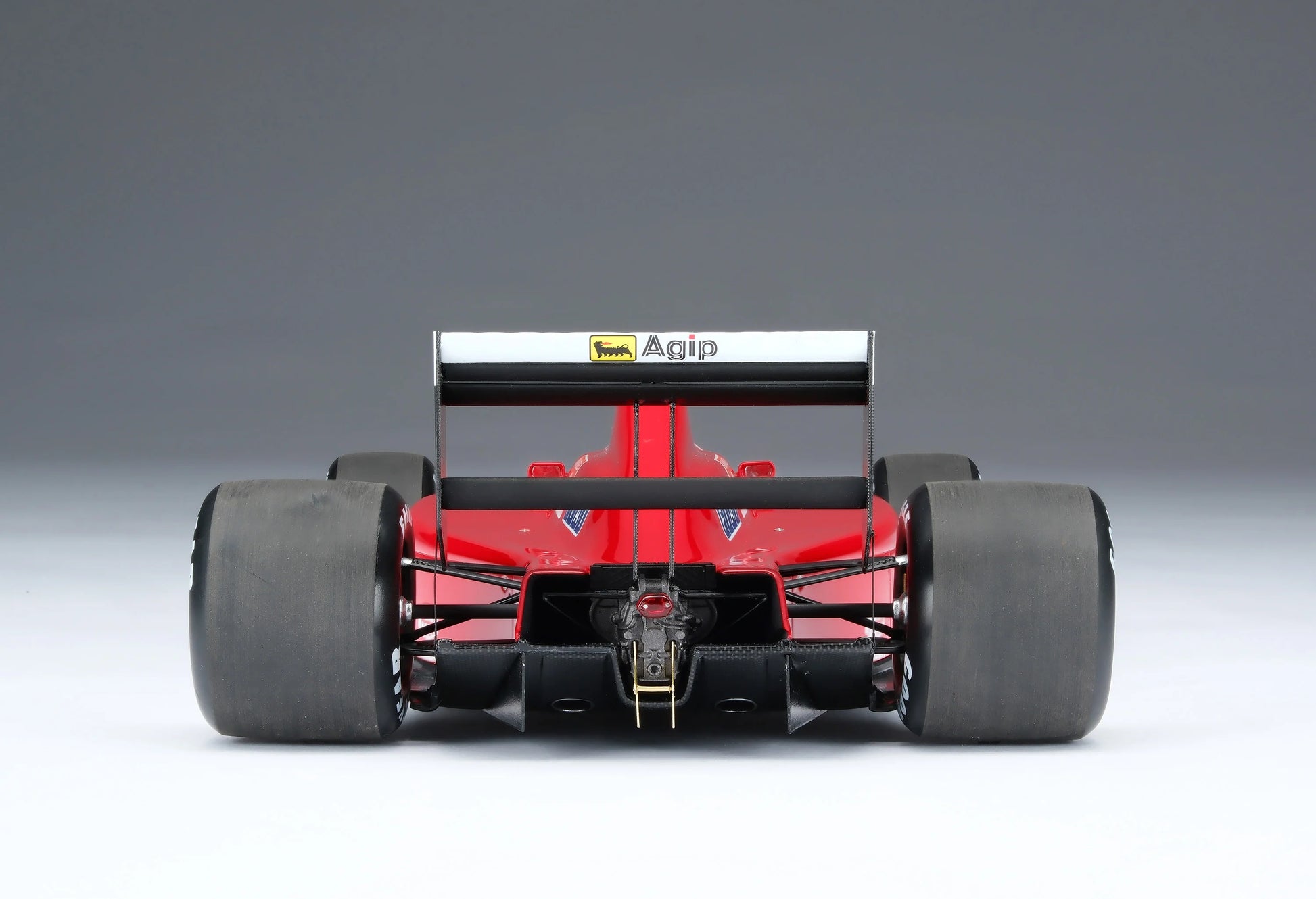 This 1:18 scale model is of the Ferrari F1-89 as raced by Nigel Mansell and Gerhard Berger during the XLII Shell British Grand Prix at Silverstone Circuit on the 16th of July 1989. Mansell qualified in third at Silverstone with Berger in fourth, behind the McLarens of Ayrton Senna and Alain Prost. The Ferrari duo started the race cleanly, letting their main rivals battle into the first corner. Berger pulled into the pits with electrical issues, re-joining the race several laps later. Senna span into the gravel on the entry to Becketts on lap 12, due to gear selection issues, promoting Prost into the lead and Mansell into second. The leading pair extended their lead over the rest of the field, Prost maintaining a slim advantage over the British racer. On lap 42, Mansell developed a puncture on his front right tyre, forcing him to pit, handing full advantage to the Frenchman. Prost was delayed on his own scheduled pit stop but returned to the track with a healthy lead over Mansell. Prost reached the chequered flag 19 seconds ahead of Mansell, with a further 29 second gap to the Benetton of Alessandro Nannini completing the podium. Berger ultimately retired on lap 49 with a mechanical issue.